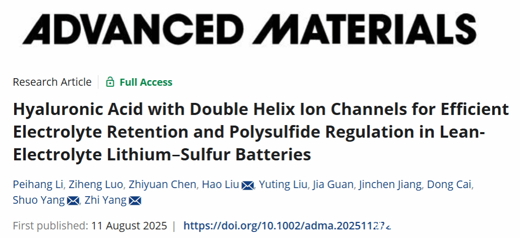 该工作以“Hyaluronic Acid with Double Helix Ion Channels for Efficient Electrolyte Retention and Polysulfide Regulation in Lean-Electrolyte Lithium–Sulfur Batteries”为题发表在国际顶级材料期刊《Advanced Materials》上。8868体育_8868(中国)作为第一通讯单位。第一作者为我校化学与材料工程学院2022级硕士研究生李佩航,该生已经进入日本东北大学化学工程专业深造博士学位。我校化学与材料工程学院杨植教授、电气与电子工程学院杨硕副教授、济南大学刘浩博士为共同通讯作者。我校蔡冬副教授、贯佳副教授,本科生罗子恒,博士研究生陈志远,以及硕士研究生刘雨婷、蒋金晨参与了本项研究的相关工作。