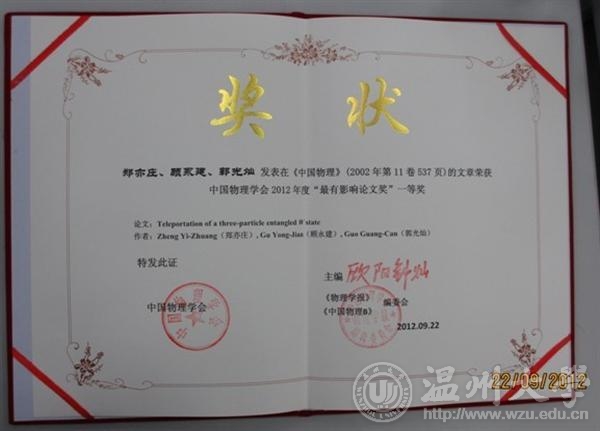 日前,在广州中山大学举行的中国物理学会秋季年会上首次颁发了中国物理学会最有影响论文奖。该奖颁发给过去10年在中国物理学会所属的《Chinese Physics Letter》,《Chinese Physics B》和《物理学报》上发表的优秀论文,共27 篇。我校物电学院郑亦庄教授与中国科大郭光灿院士等合作发表在《Chinese Physics B》上的题为《Teleportation of a three-particle entangled W state》的论文荣获一等奖。