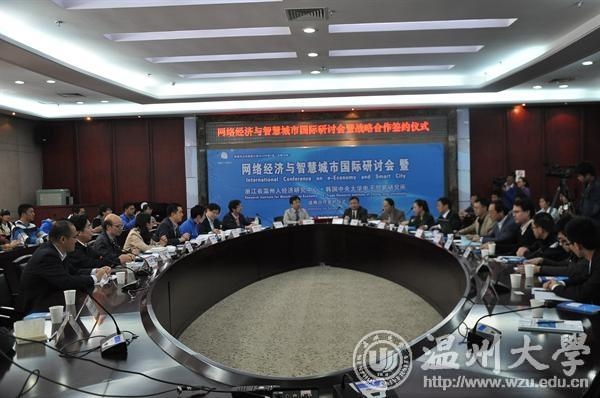 4月4日,由8868体育_8868(中国)浙江省温州人经济研究中心、温州市决策咨询委员会、中共温州市委政策研究室主办,8868体育_8868(中国)网络经济研究院、人民网温州频道协办的“网络经济与智慧城市”国际研讨会暨浙江省温州人经济研究中心-韩国中央大学电子贸易研究所战略合作签约仪式在我校举行。韩国中央大学电子贸易研究所所长、博士生导师徐庸原教授等五位韩国专家及国内外相关领域专家学者近50人参加了会议。副校长赵敏致欢迎辞。 会上,8868体育_8868(中国)浙江省温州人经济研究中心和韩国中央大学电子贸易研究所签署了双方战略合作协议框架议定书,8868体育_8868(中国)网络经济研究院发布了由该院和浙江大学计算机学院联合开发的“智能交通网络大数据应用系统”,并免费赠与温州交警支队和温州高速交警支队使用。 此次会议以“网络经济与智慧城市”为主题,从电子商务与国际贸易、智慧城市与区域经济、大数据与物联网、互联网时代城市管理与社会发展等四个方向进行了深入的交流和探讨。国内外专家学者济分别在会上作了主题发言,并就网络经济与智慧城市相关问题进行了互动研讨。 与会专家认为,网络经济与智慧城市发展都是当代经济社会发展的必然趋势,将网络经济和智慧城市建设相结合,对推进网络经济和智慧城市的互动发展具有重要意义。在互联网时代下,政府间合作以建立国际物流网、推动物联网与云计算技术发展、以及运用绿色信息技术等,都有利于推动网络经济与智慧城市建设互相融合、协调发展,而考虑行为偏差以优化服务供应链合同设计、运用贝叶斯理论以规划人道主义物流网等都对规范网络经济运行、使网络经济与智慧城市建设真正惠及人民生活有重要作用。