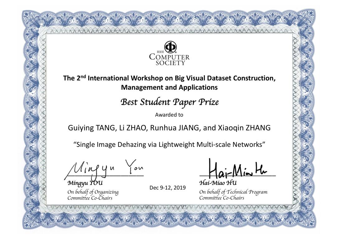 近日,在洛杉矶召开的第二届国际视觉大数据构建、管理与应用会议上,我校计算机与人工智能学院张笑钦教授指导的研究生唐贵英、蒋润华的论文《Single Image Dehazing via Lightweight Multi-scale Networks》从众多文章中脱颖而出,获得大会颁发的最佳学生论文奖。