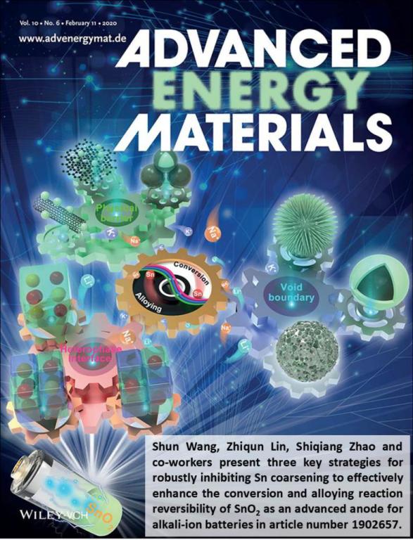 近日,国际能源顶级刊物《Advanced Energy Materials》将有关二氧化锡作为碱金属离子电池负极的综述论文“SnO2as Advanced Anode of Alkali-Ion Batteries: Inhibiting Sn Coarsening by Crafting Robust Physical Barriers, Void Boundaries, and Heterophase Interfaces for Superior Electrochemical Reaction Reversibility”选为期刊封面文章。该文章第一作者为赵世强博士,化材学院院长王舜教授与佐治亚理工学院林志群教授为通讯作者,8868体育_8868(中国)为第一通讯单位。