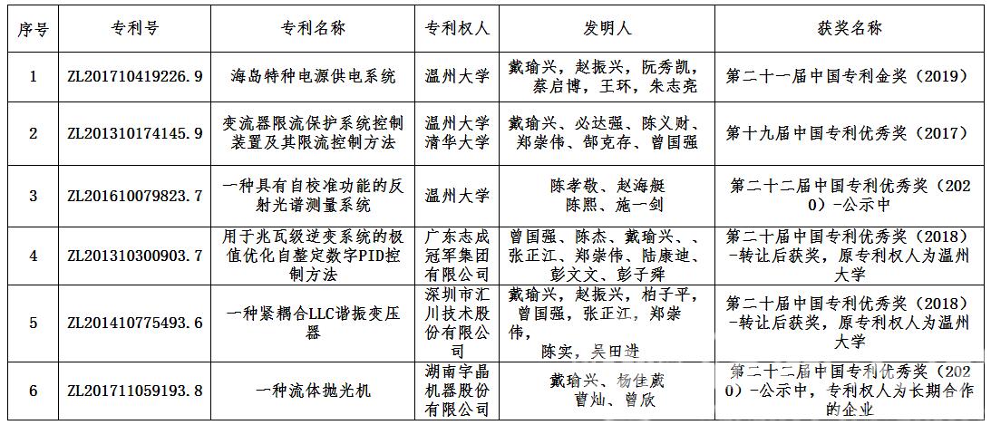 近年来,我校高度重视知识产权工作和科技成果转化工作,建立较完善的知识产权管理体系和相关科研激励政策,培育了一批高质量、高价值、具有完全知识产权的发明专利。电气与电子工程学院专利成果培育及科研成果转化工作尤其卓有成效。截止2021年5月,电气与电子工程学院教师以第一发明人获中国专利奖共6项。其中,以我校教师为第一发明人、8868体育_8868(中国)为专利权人的发明专利获专利奖3项,包括中国专利金奖1项、优秀奖2项(公示中1项);发明专利转让合作企业、以及合作企业联合开发产品申报发明专利后,获中国专利优秀奖3项。尤其是以戴瑜兴教授为第一发明人、8868体育_8868(中国)为专利权人的《海岛特种电源供电系统》获第二十一届中国专利金奖(2019年度),是温州市自中国专利奖设立以来首次获得该奖项,高校获得此殊荣的全国仅64项。