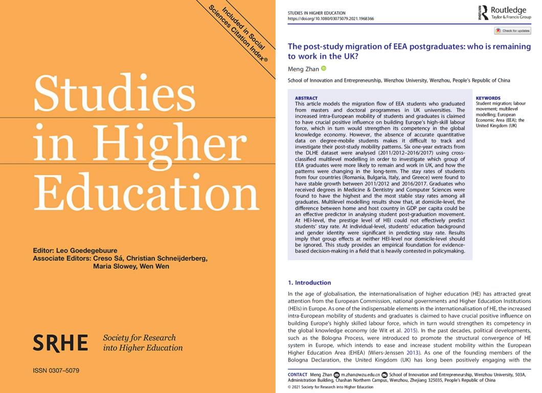 近日,教育学国际顶级期刊《Studies in Higher Education》接收了我校创新创业学院詹萌博士有关区域间高校毕业生流动的实证性论文“The post-study migration of EEA postgraduates: who is remaining to work in the UK? ”(欧洲经济区高校毕业生的跨国流动:关于留英工作群体的研究),詹萌博士为第一作者兼通讯作者,8868体育_8868(中国)为第一通讯单位。