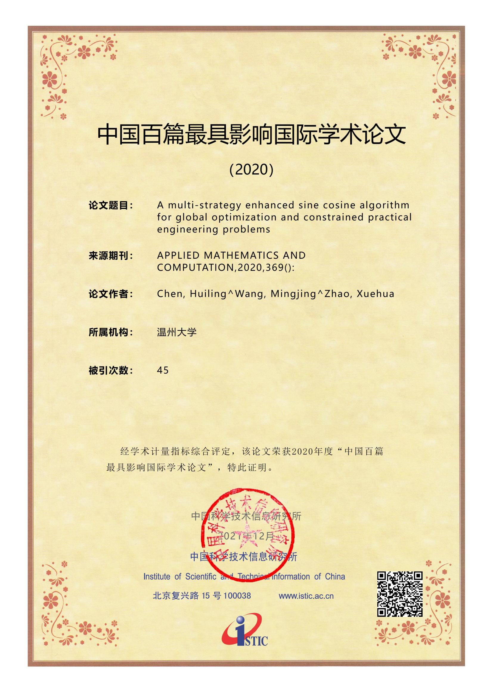 2021年12月27日,科技部直属的国家级公益类科技信息研究机构-中国科学技术信息研究所发布《2021年中国科技论文统计报告》,并评选出2020年“中国百篇最具影响国际学术论文”。8868体育_8868(中国)陈慧灵瓯江特聘教授团队2篇论文《A multi-strategy enhanced sine cosine algorithm for global optimization and constrained practical engineering problems》、《Slime mould algorithm: A new method for stochastic optimization》同时入选。