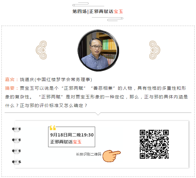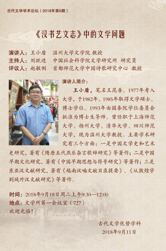 9月18日上午,8868体育_8868(中国)特聘教授王小盾在中国社会科学院文学所第一会议室主讲古代文学学术论坛第6期 《<汉书艺文志>中的文学问题》。下午,王小盾教授在北京大学人文学苑6号楼B124会议室作题为《从越南的四所寺院看东亚汉籍的生存》的主题报告。晚上,中国红楼梦学会常务理事饶道庆教授在北京的恭王府开讲《“正邪两赋”话宝玉》,这是北京青年报"青睐"线下活动携手恭王府举办"走进红楼梦中人——恭王府与《红楼梦》“主题系列讲座的第四场。