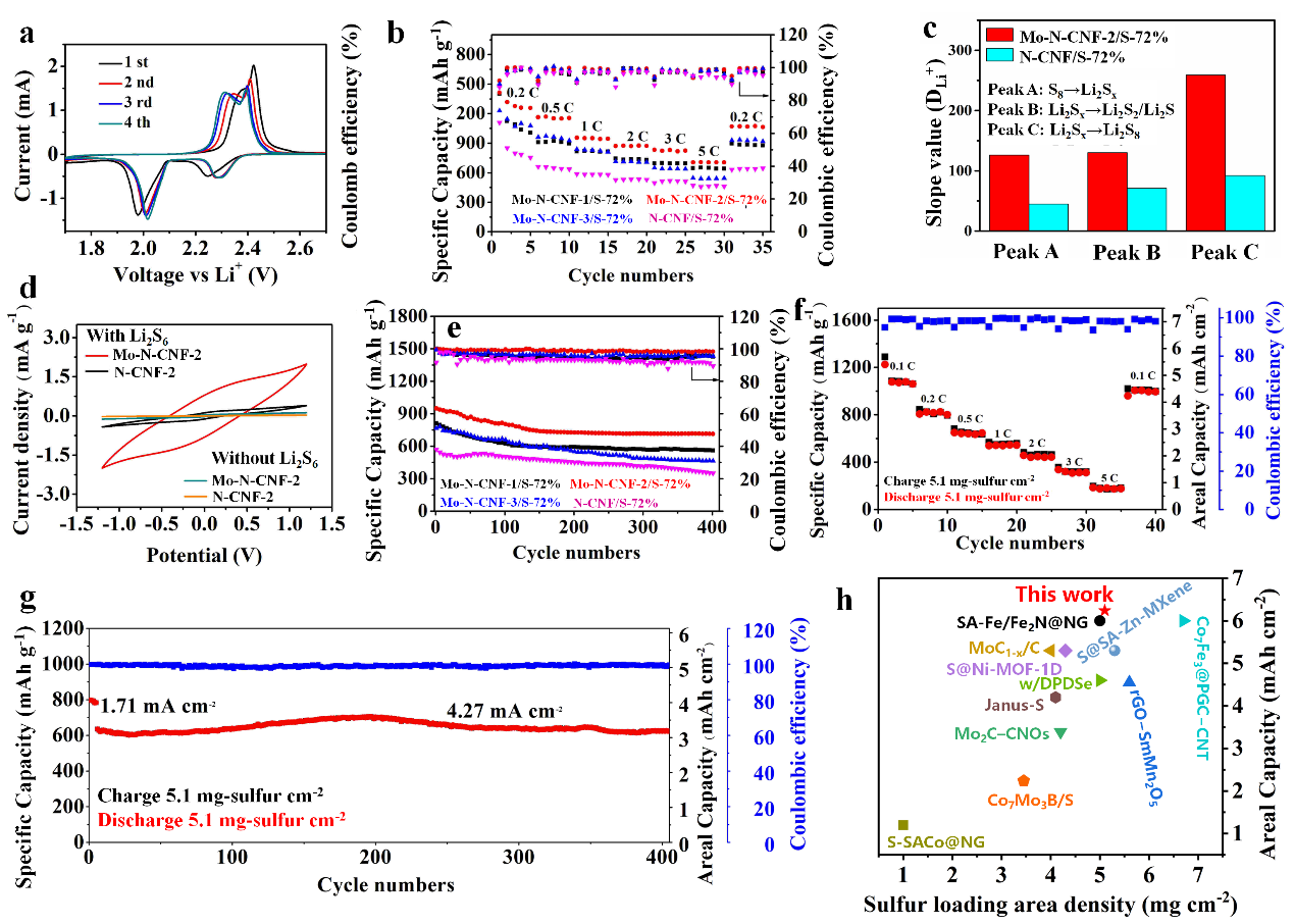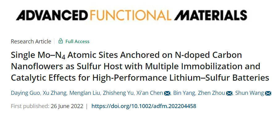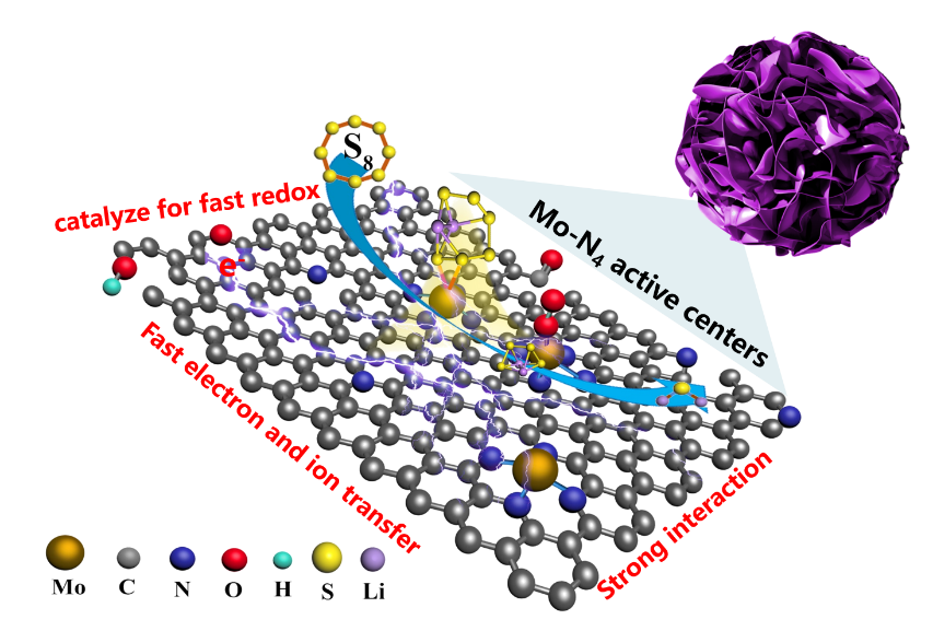 近日,我校陈锡安教授课题组在国际顶级期刊《Advanced Functional Materials》发表题为“Single Mo–N4 Atomic Sites Anchored on N-doped Carbon Nanoflowers as Sulfur Host with Multiple Immobilization and Catalytic Effects for High-Performance Lithium–Sulfur Batteries”的论文。该工作在新颖碳球结构设计(J. Mater. Chem. A,2017, 5, 18193-18206.)和氮掺杂花型碳纳米球(J. Mater. Chem. A,2017, 5, 6245-6256)的基础上开发了一种单原子钼以四氮配位(Mo-N4)的形式锚定在N 掺杂碳纳米花上作为锂硫电池硫阴极,显著提高电池性能。利用独特设计的花型结构碳球和高活性Mo-N4催化中心,表现出多重固定和催化多硫化物作用,能够快速将液相多硫化锂(Li2Sn, 4≤n≤8)催化转化固相硫化锂(Li2S),从而有效抑制多硫化物穿梭效应。基于此,这项工作中设计的LSBs表现出优异的倍率性能和长期稳定性。 特别是在5.1 mg cm-2的高载硫下,面积比容量达到初始容量3.24 mAh cm-2(4.27 mA cm-2),经过400次循环后面积比容量保持在3.17 mAh cm-2,衰减率仅为0.004%。这种通过将单原子催化剂锚定在氮掺杂碳纳米球上结构设计策略为锂硫电池应用带来光明的未来。