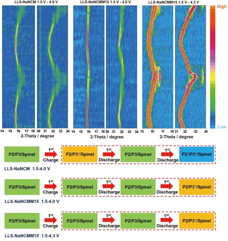 近日,我校化材学院碳中和技术创新研究院侴术雷/肖遥团队在国际顶级期刊《Advanced Energy Materials》上发表题为“Strain Engineering by Local Chemistry Manipulation of Triphase Heterostructured Oxide Cathodes to Facilitate Phase Transitions for High-Performance Sodium-Ion Batteries”的研究论文。本文提出一种基于局域化学调控的应变工程策略来调节材料的物理化学性质成功制备出具有三相异质共生结构层状氧化物正极材料Layered/Layered/Spinel-Na0.5Ni0.2Co0.15Mn0.65O2(LLS-NaNCM)和Layered/Layered/Spinel-Na0.5Ni0.05Co0.15Mn0.65Mg0.15O2(LLS-NaNCMM15),研究发现LLS-NaNCMM15正极具有高度可逆的相转变过程。值得注意的是,LLS-NaNCMM15正极材料在1.5 ~ 4.3 V的电压窗口内也表现出高度可逆的晶体结构演变(P2/P3/Spinel→P2/P3″/Spinel)。同时,该电极具有高的可逆容量和优异倍率性能。本文揭示了局域化学调控机制,实现了正极材料的应变工程,为进一步提高钠离子电池的性能奠定了基础。