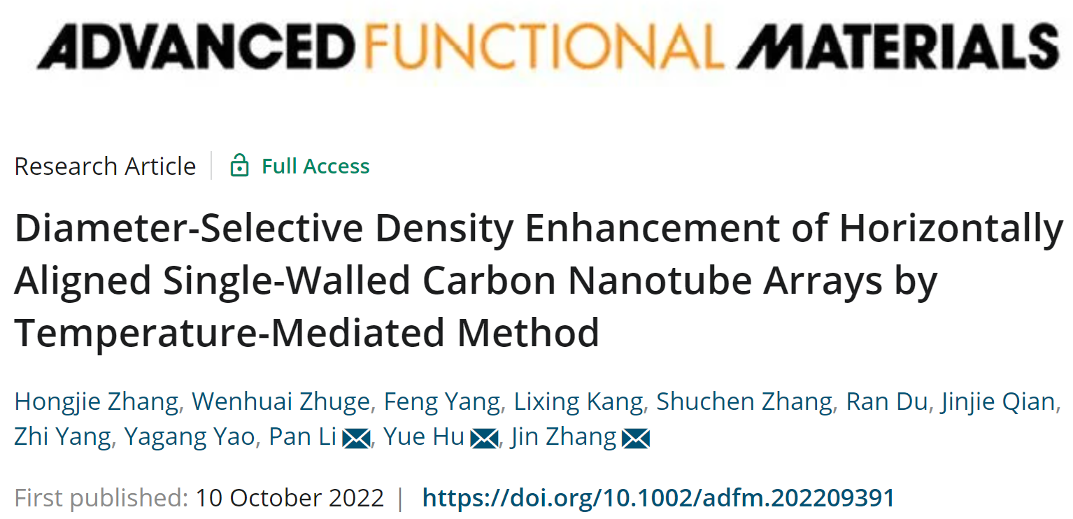 近日我校化材学院胡悦特聘教授团队联合南京邮电大学李盼副教授、北京大学张锦教授在控制制备高密度单壁碳纳米管(SWNT)方面取得新进展,开发了一种简单且新颖的温度扰动策略以制备具有管径选择性的高密度SWNT阵列,为SWNT在纳电子器件方面的提供了理想平台。相关成果以标题“Diameter-Selective Density Enhancement of Horizontally Aligned Single-Walled Carbon Nanotube Arrays by Temperature-Mediated Method”(DOI:10.1002/adfm.202209391)发表在Advanced Functional Materials。该工作通过调节温度对金属催化剂容碳量进行调控,再活化具有特定尺寸的因被碳包覆而失活的催化剂,使其继续催化生长特定管径的SWNT。最终使得在石英基底上获得的SWNT阵列的密度增加了三倍以上,且管径分布控制在2纳米左右。并通过环境透射电子显微镜对催化剂再活化过程进行原位研究,为催化剂效率的提高提供了关键性的见解。使用获得的SWNT阵列制作场效应晶体管器件,该器件表现出非常优秀的载流子迁移能力,表明所获得的SWNT阵列在纳电子器件中的应用潜力。相关文章发表在Advanced Functional Materials上,8868体育_8868(中国)为第一通讯单位,我校化材学院2019级研究生张红杰为第一作者,化材学院胡悦特聘教授、南京邮电大学李盼副教授及北京大学张锦教授为共同通讯作者。相关工作受到国家自然科学基金和浙江省自然科学基金项目的资助。