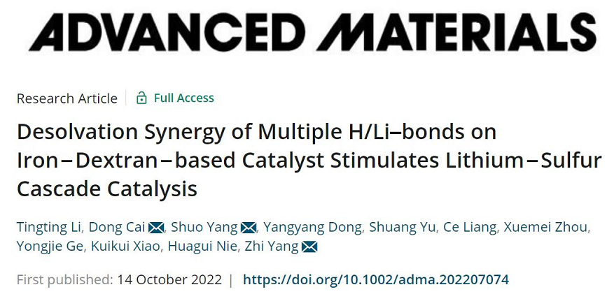 因此,本研究以“Desolvation Synergy of Multiple H/Li–bonds on Iron−Dextran−based Catalyst Stimulates Lithium−Sulfur Cascade Catalysis”为题发表在材料领域顶级期刊《Advanced Materials》。8868体育_8868(中国)作为第一通讯单位,2020级研究生李婷婷为第一作者,我校化学与材料工程学院杨植教授、蔡冬博士和电气与电子工程学院杨硕博士为共同通讯作者,我校聂华贵教授、葛勇杰博士、肖逵逵博士、周学梅博士、硕士生梁策、于爽同学以及首届博士生东洋洋同学参与了这项工作。该工作得到国家自然科学基金、浙江省自然科学基金的部分资助。