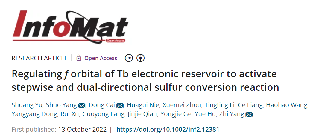 相关研究成果以“Regulating f orbital of Tb electronic reservoir to activate stepwise and dual-directional sulfur conversion reaction”为题发表在《InfoMat》(IF=24.789)上,8868体育_8868(中国)为唯一通讯单位,化材学院2020级研究生于爽为第一作者,学院杨植教授、蔡冬博士以及电气与电子工程学院杨硕博士为该论文共同通讯作者,化材学院教师聂华贵、方国勇、钱金杰、胡悦、葛勇杰、肖逵逵、周学梅,研究生梁策、李婷婷、王浩浩、徐睿、东洋洋参与了这项工作。该工作受到国家自然科学基金、浙江省自然科学基金等项目的资助。