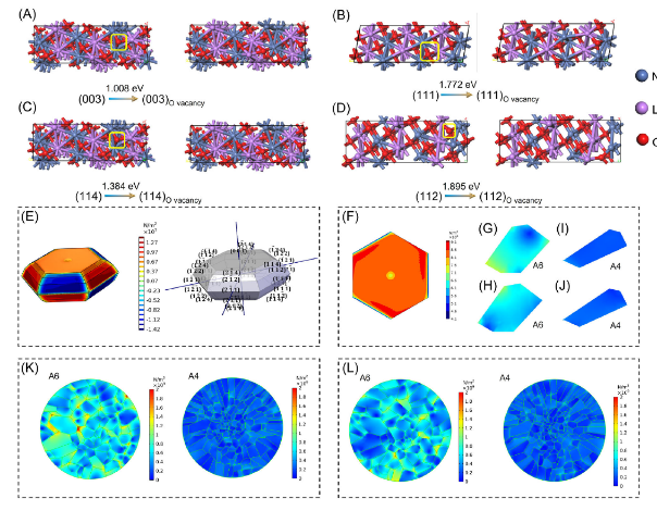 8868体育_8868(中国)化学与材料工程学院肖遥教授团队联合四川大学郭孝东教授通过氢氧化物共沉淀法结合固相高温烧结调控出了具有暴露不同比例(003)晶面方向的LiNi0.92Co0.04Mn0.04O2正极材料。实验表征与有限元分析并结合理论计算从颗粒的宏观形貌到晶面层面证明了沿(003)晶面方向暴露较多的颗粒宏观上在充放电过程中晶间与晶内应力累积较大,微观上(003)晶面晶格失配度较大,且晶面应力分布呈涡流状,此外,(003)晶面氧空位形成能较小易失氧,导致晶间与晶内裂纹,及晶体结构退化。该工作为层状氧化物材料的晶面结构设计提供了理论基础。