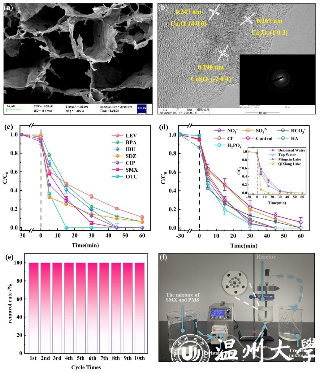 图1(a)rGO-8CoPcS-SA材料的SEM图像;(b)rGO-8CoPcS-SA材料的TEM图像(内插图:SEAD衍射);(c)rGO-8CoPcS-SA/PMS体系中多种抗生素和内分泌干扰物降解曲线;(d)阴离子和有机质共存时,rGO-8CoPcS-SA/PMS体系中SMX的降解曲线(内插图:实际水体中,rGO-8CoPcS-SA/PMS体系对SMX的降解曲线);(c)rGO-8CoPcS-SA材料循环利用实验中SMX的降解率;(d)连续流运行装置示意图