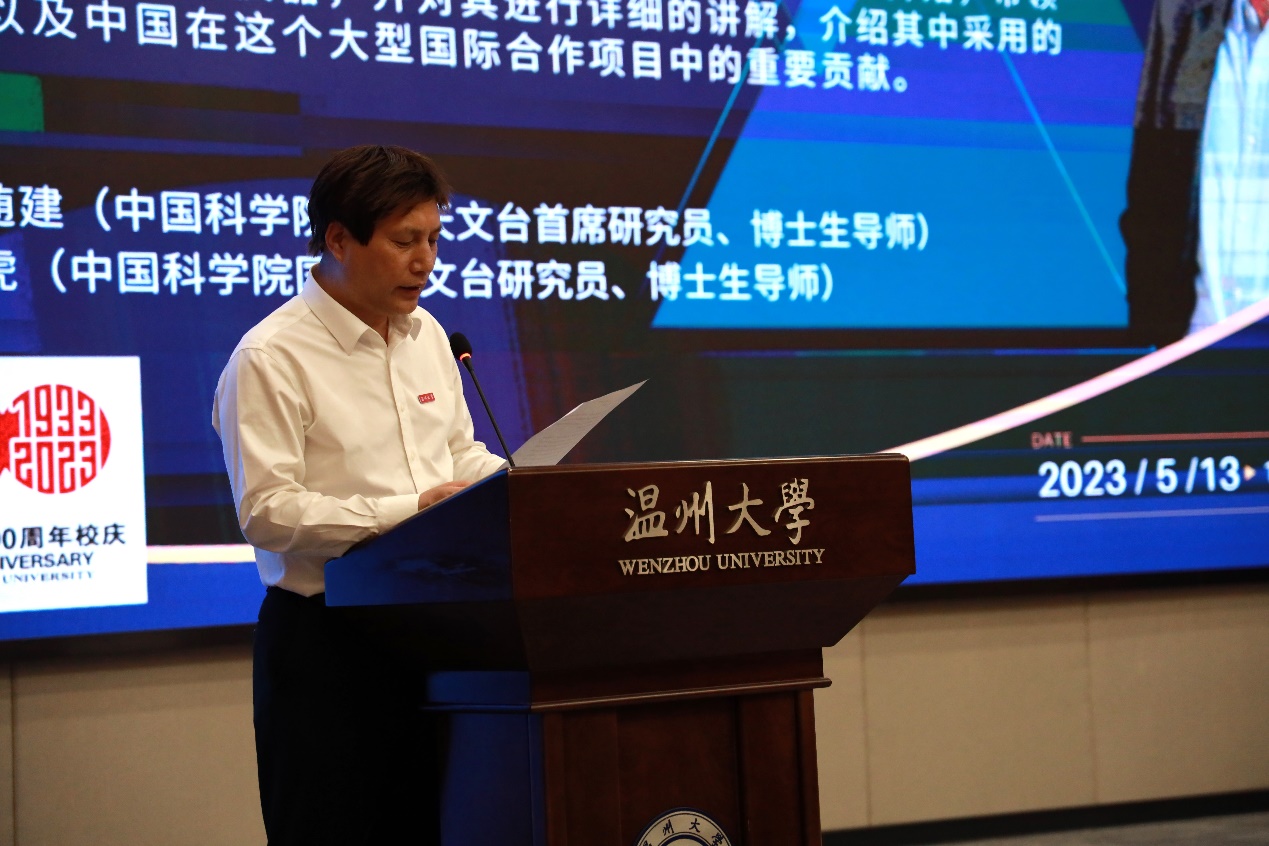 在我校迎来办学90周年之际,5月13日下午,中国科学院国家天文台原副台长、巡天观测研究团组首席研究员、博士生导师薛随建,“温大星”发现者代表、中国科学院国家天文台研究员、博士生导师邹虎应邀做客我校罗山讲堂,作题为《千眼观宇百亿年》的学术讲座。校党委委员、纪委书记杨林书主持。我校师生、温大附属榕园学校的部分中小学生到场聆听,同时进行线上同步直播。