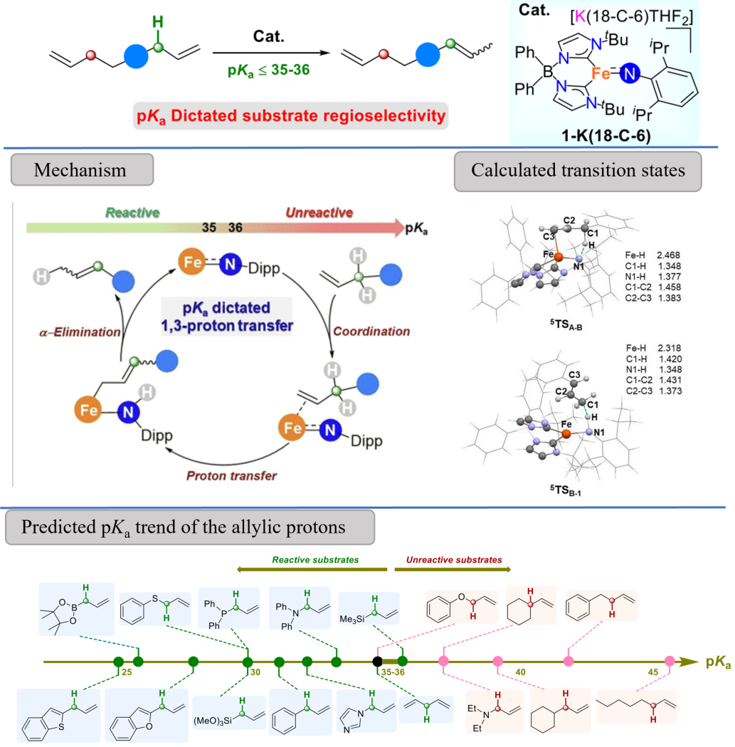 我校化材学院汤浩教授理论计算课题组与美国印第安纳大学化学系Jeremy M. Smith教授课题组合作报道了高自旋三配位Fe(II)亚胺配合物(1-K-(18-C-6))催化的双键转位反应,通过1,3-氢质子迁移实现了1-烯烃向2-烯烃的转化。其中,双键转位是由Fe(II)中心和碱性亚胺配体的协同作用实现。DFT计算的过渡态结构揭示了烯丙基氢直接从1-烯烃转移到亚胺配体上(5TSA-B) ,随后烯丙基C1与氨基配体上的氢结合 (5TSB-1)获得相应的产物,而Fe–H物种并未参与。底物烯丙基质子的pKa决定反应的区域选择性,而且双键转位发生的转折点在于烯丙基质子的pKa ≈ 35−36处。值得一提的是:铁催化剂的高自旋(S = 2)允许反应具有良好的官能团耐受性,包括典型毒化催化剂的位点,如胺、含N-杂环、膦化物等。