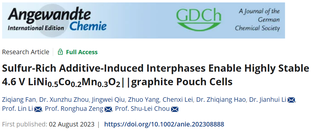 近日我校化学与材料工程学院碳中和技术创新研究院李林团队联合华南师范大学曾荣华教授、李键辉博士在国际权威期刊Angewandte Chemie International Edition上发表题为《Sulfur-Rich Additive-Induced Interphases Enable Highly Stable 4.6 V LiNi0.5Co0.2Mn0.3O2||graphite Pouch Cells》的学术论文。本论文通过在4.6 V LiNi0.5Co0.2Mn0.3O2 (NCM523)||石墨软包电池中引入含硫量为34.04%的超高含硫量添加剂(甲烷二磺酸亚甲酯,MMDS),从而构建了一种由添加剂诱导形成的稳固富硫电极-电解液面相。在4.6 V高电压条件下,循环800次,含MMDS添加剂的NCM523||石墨软包电池仍具有87.99%的高容量保持率以及更好的倍率性能,且与较低硫含量的一系列添加剂做对比,突出了高含硫量添加剂MMDS的优势。结合实验表征以及理论计算,进一步探究了MMDS添加剂在溶剂中的优先氧化还原性,从而证明它能够优先在正负极上界面构筑稳定的富硫电极-电解液界面膜,该界面相的存在成功稳定了高电压NCM523||石墨软包电池,显著提高了电池的循环稳定性。同时实验结果也表明MMDS分解所构筑的富硫界面相在抑制电解液消耗、产气以及稳定电极材料、减少过渡金属溶出上有着非常好的效果。相关文章发表在Angewandte Chemie International Edition上,8868体育_8868(中国)为第一通讯单位,化材学院联培生华南师范大学2021级硕士范自强和博士后周洵竹为第一作者,化材学院院侴术雷教授,李林特聘教授以及华南师范大学曾荣华教授,李健辉博士为共同通讯作者,相关工作受到国家自然科学基金,浙江省自然科学基金,国家电网科技项目,温州自然科学基金以及广州市科技计划项目的资助。