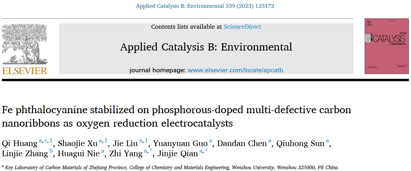 本论文以“Fe phthalocyanine stabilized on phosphorous-doped multi-defective carbon nanoribbons as oxygen reduction electrocatalysts”为题发表在《Applied Catalysis B: Environmental》上,2023年影响因子22.1。8868体育_8868(中国)为第一通讯单位,我校化学与材料工程学院钱金杰副教授和杨植教授为通讯作者,化学与材料工程学院2019级硕士研究生黄淇、2021级硕士研究生徐少杰和2022级硕士研究生刘捷为共同第一作者。该工作受到国家自然科学基金(21601137)、浙江省自然科学基金(LQ16B010003)、浙江省温州市基础科技研究项目(H20220001)、中国科学院结构化学国家重点实验室项目(20190008)和云南省地方本科高校基础研究联合专项资金项目(202101BA070001-042)的资助。