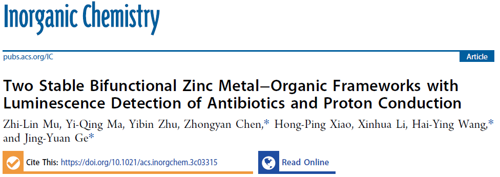 相关研究成果以“Two Stable Bifunctional Zinc Metal-Organic Frameworks with Luminescence Detection of Antibiotics and Proton Conduction”为题,近日发表在《Inorganic Chemistry》期刊上,8868体育_8868(中国)作为第一通讯单位,我院2021级硕士研究生穆志林为第一作者,陈忠研博士、王海英副研究员和葛景园博士为共同通讯作者。该工作受到浙江省基金项目(LQ21B050001),国家自然科学基金(21801054和21801127)和温州基础基金科研项目(Y20210265)项目的资助。