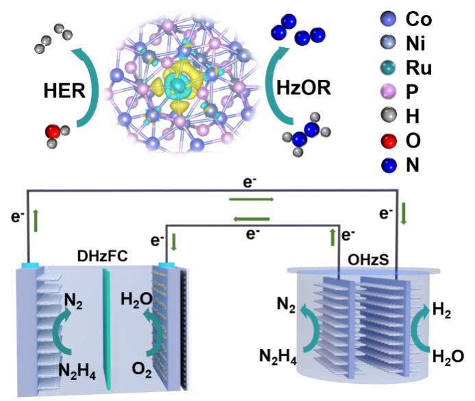 氢能,具有高能量密度和零碳排放等优点,被认为是未来替代传统化石燃料的最有前途的能源。其中,由可再生能源驱动的电解水是一种高效、环保的产生高纯度氢气的策略。然而,阳极析氧反应(OER, 1.23 V vs. RHE)的反应动力学迟缓,严重阻碍了电解水的发展和实际应用。近年来,研究人员致力于用热力学上更容易发生的小分子氧化反应(如醇类、胺类、葡萄糖、尿素、亚砜和肼)来替代OER,以实现节能的氢气生产。其中,肼氧化反应(HzOR)因其较低的理论电位(N2H4 + 4OH− = N2 + 4H2O, -0.33 V)和高安全性(N2是唯一的副产物)而受到广泛关注。目前,人们已经致力于开发基于非贵金属的高效HzOR电催化剂,例如过渡金属硫化物、磷化物和氮化物等。然而,非贵金属往往倾向于促进N-N键的断裂,导致肼的不完全氧化和产生NH3等副产物。此外,大多数报道的非贵金属催化剂仅对参与整体肼分解的半电池反应表现出良好性能。开发高效低成本的双功能电催化剂用于HzOR和析氢反应(HER),可以简化器件制造并降低成本,在电解系统的应用中非常有价值,但仍然面临挑战。