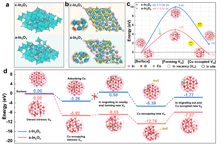 我校化材学院陈伟、时茜教授课题组和中国科学技术大学洪勋教授课题组在国际知名期刊《Nano Letters》发表题为“Amorphization-induced cation exchange in indium oxide nanosheets for CO2-to-ethanol conversion”的论文。该工作在理论计算的指导下,以无定形In2O3纳米片(a-In2O3 NSs)为主体材料,在室温下与多种客体阳离子进行CE反应。密度泛函理论(DFT)计算表明,无定形纳米材料中丰富的配位-不饱和金属位点对于突破CE反应的能垒以调控金属氧化物的组成至关重要。