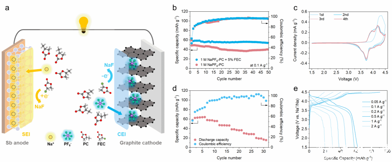 近日我校化材学院碳中和技术创新研究院李林团队联合南开大学赵庆教授以及澳大利亚伍仑贡大学赖伟鸿教授在国际权威期刊《Angewandte Chemie International Edition》上发表题为《Insight into the Role of Fluoroethylene Carbonate on the Stability of Sb||Graphite Dual-Ion Batteries in Propylene Carbonate-Based Electrolyte》的学术论文。本论文以锑(Sb)和石墨分别作为阳极和阴极,研究了含有氟代碳酸乙烯酯(FEC)添加剂的电解液中Na- DIBs的电化学性能。与不含FEC的电解液(1 M NaPF6-碳酸丙烯酯(PC))相比,作者发现加入FEC添加剂(5 wt.%)可促进阴极和阳极上富含NaF的无机电极电解质界面的形成,并改变PF6-阴离子的溶剂化行为。这种改性不仅有效抑制了NaPF6盐和PC溶剂的过度分解,还促进了PF6-阴离子在石墨阴极中的插层。制备的Sb||石墨全电池在50次循环后达到了58.5 mAh g-1的高放电比容量,容量保留率为93.1%(而传统电解质分别为48.3 mAh g-1和79.7%)。此外,在功率密度为157.78 W kg-1时,电池的能量密度为194.95 Wh kg-1(基于正极和负极的活性材料的质量)。本工作阐明了双功能FEC的潜在机制,并为构建高性能双离子电池提供了一种替代策略,促进了他们在未来可持续储能系统中的实际应用。