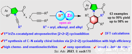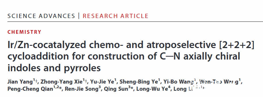 论文链接:Ir/Zn-cocatalyzed chemo- and atroposelective [2+2+2] cycloaddition for construction of C−N axially chiral indoles and pyrroles. Jian Yang1#, Zhong-Yang Xie1#, Yu-Jie Ye1, Sheng-Bing Ye1, Yi-Bo Wang1, Wen-Tao Wang1, Peng-Cheng Qian*1,4, Ren-Jie Song2, Qing Sun*2, Long-Wu Ye3, and Long Li*1,3,4 Sci. Adv. 2023, 9, eadk170. DOI: 10.1126/sciadv.adk1704.