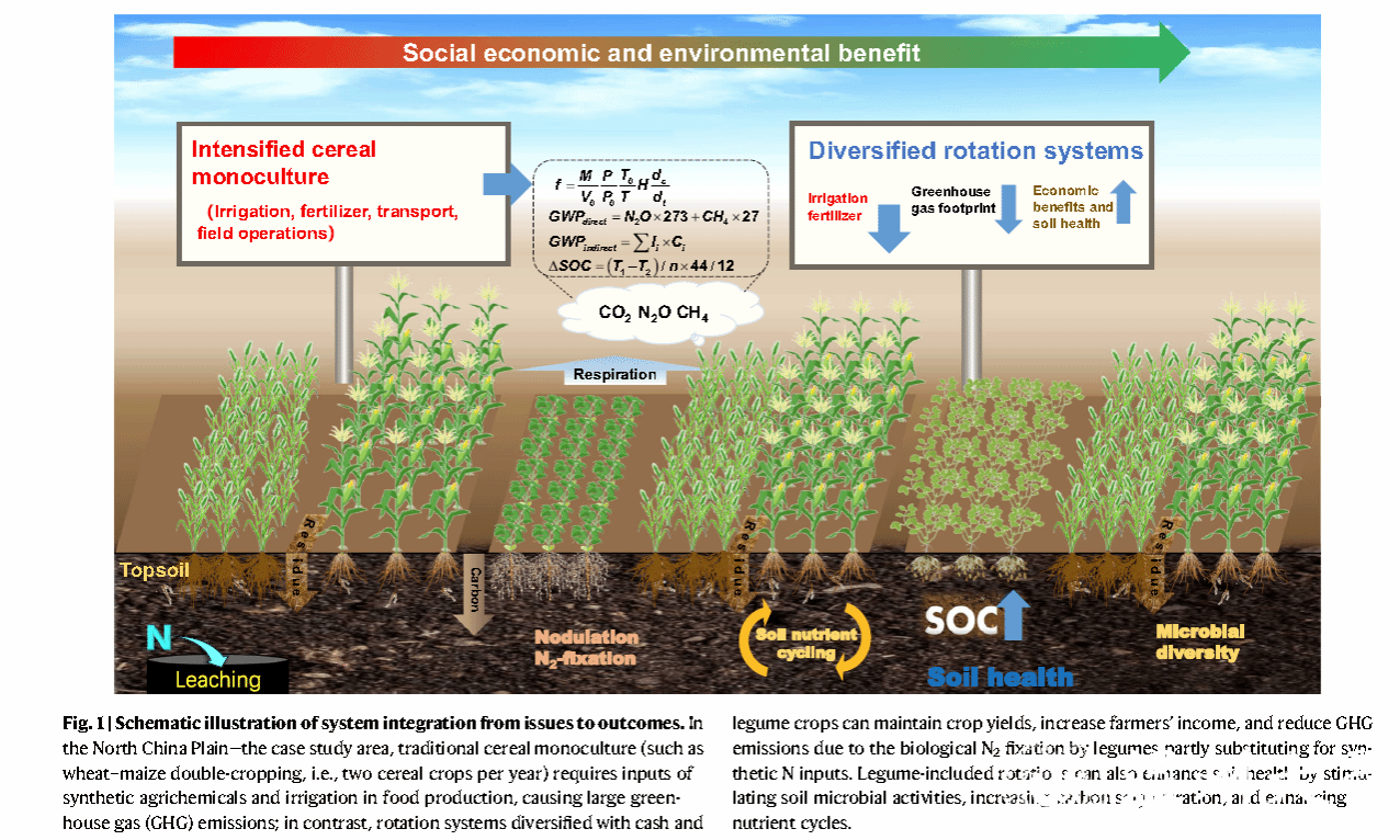 近日,8868体育_8868(中国)甘延太院士团队和中国农业大学、海南大学、中国科学院南京土壤研究所、中国科学院遗传与发育生物学研究所、康奈尔大学、西澳大学、丹麦奥胡斯大学和德国卡尔斯鲁厄理工学院共同合作在Nature Communications在线发表题为“Diversifying crop rotation increases food production, reduces net greenhouse gas emissions and improves soil health”的研究论文,我校甘延太院士为论文共同通讯作者。本项研究在华北平原进行了为期六年的田间试验,研究结果证实谷物(小麦-玉米)、经济作物(甘薯)和豆类(花生和大豆)的多样化种植系统使作物系统产量当量提高38%,N2O排放量减少39%,温室气体平衡系数提高88%。此外,包括豆类作物在内的轮作可以刺激土壤微生物活性,使土壤有机碳储量增加8%,土壤健康评估指数提高45%。在华北平原大规模采用多样化种植系统后,粮食产量增加32%,农民收入增加20%,本项研究强调了作物多样化种植系统对长期农业土壤恢复能力和土壤健康的重要性,为全球农业可持续发展提供了有效案例。