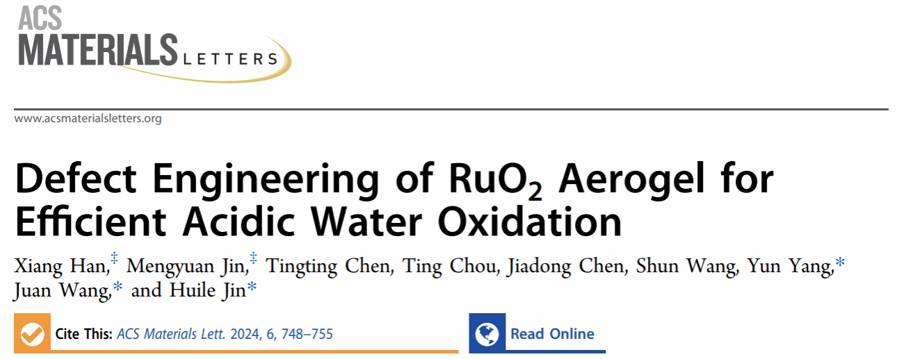 近日,8868体育_8868(中国)2021级化学(师范)专业本科生韩翔在权威期刊ACS Material Letters上发表题为Defect Engineering of RuO2 Aerogel for Efficient Acidic Water Oxidation(缺陷工程助力RuO2气凝胶用于高效酸性水氧化)的研究论文(指导教师为王娟副教授、金辉乐研究员和杨云研究员)。