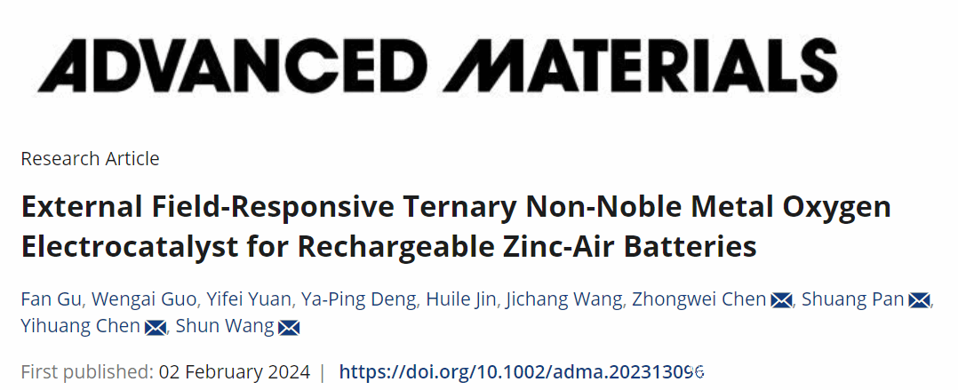 该成果以“External Field-Responsive Ternary Non-Noble Metal Oxygen Electrocatalyst for Rechargeable Zinc-Air Batteries”为题发表在Advanced Materials期刊(IF=29.4,SCI一区)上。8868体育_8868(中国)为第一通讯单位,化材学院研究生顾凡、郭文改为共同第一作者,加拿大滑铁卢大学陈忠伟院士、我校潘霜副教授、陈亦皇教授和王舜教授为共同通讯作者。该工作受到中国自然科学基金(No. 52331009、62104170和22109120)、浙江省自然科学基金(LY23F040001和LQ21B030002)的资助。