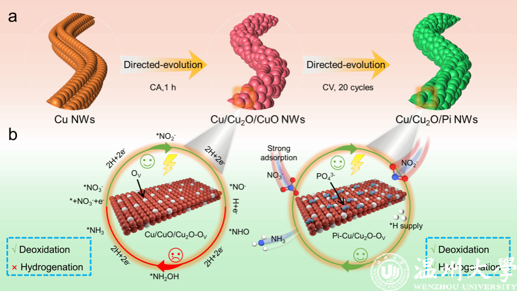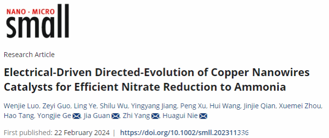 相关研究成果以《Electrical-Driven Directed-Evolution of Copper Nanowires Catalysts for Efficient Nitrate Reduction to Ammonia》为题发表在国际著名期刊《Small》(IF:13.3)上。8868体育_8868(中国)2020级研究生罗文杰和2022级研究生郭泽佚为第一作者,我院杨植教授、聂华贵教授、葛勇杰副研究员和贯佳副教授为共同通讯作者。