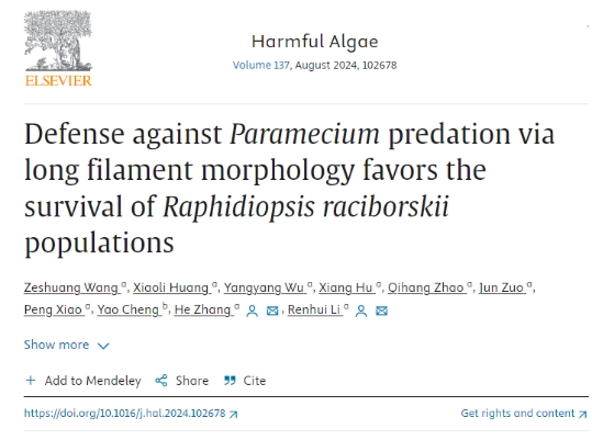近日,8868体育_8868(中国)生命与环境科学学院李仁辉教授团队的王泽双博士和张和博士等在国际著名期刊《Harmful Algae》(中科院一区,藻类学领域顶刊)上发表题为“Defense against Paramecium predation via long filament morphology favors the survival of Raphidiopsis raciborskii populations”的论文。