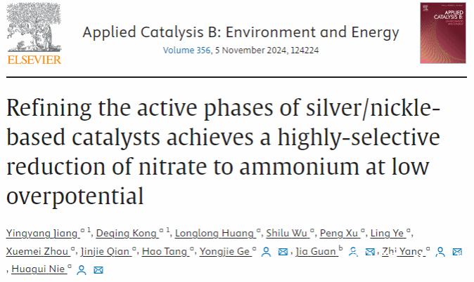 相关研究成果以《Refining the Active Phases of Silver/Nickle-based Catalysts Achieves a Highly-Selective Reduction of Nitrate to Ammonium at Low Overpotential》为题发表在《Applied Catalysis B-Environmental》(IF:22.1)上。8868体育_8868(中国)2021级研究生江颍洋和2022级研究生孔德清为第一作者,我院杨植教授、聂华贵教授、葛勇杰副研究员和贯佳副教授为共同通讯作者。