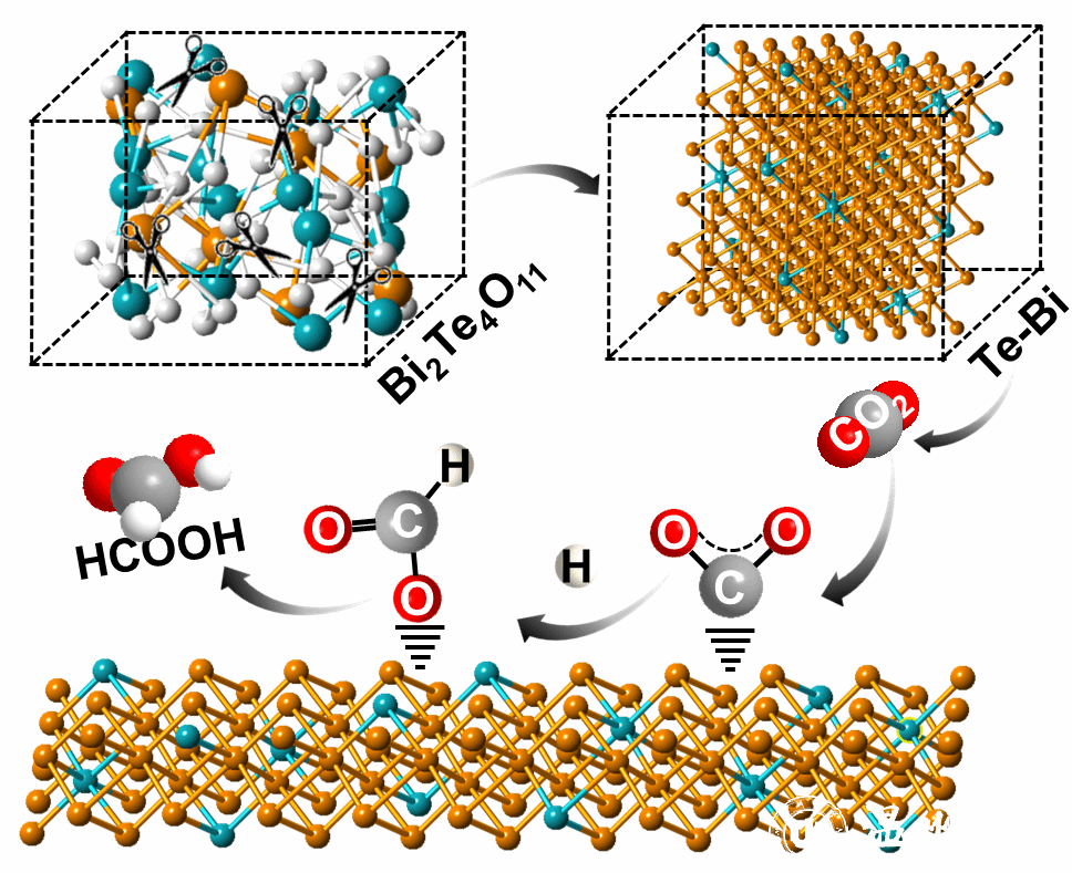近日,我校王舜/金辉乐/王娟团队在国际顶级期刊《Angew. Chem. Int. Ed.》发表题为“The Reconstruction of Bi2Te4O11 Nanorods for Efficient and pH-universal Electrochemical CO2 Reduction”的论文。在这项工作中,通过在CO2RR条件下原位重构Bi2Te4O11 NRs来开发Te修饰的Bi纳米棒(Te-Bi NRs)。使用原位X射线衍射(XRD)和原位拉曼光谱对CO2RR过程中Bi2Te4O11 NRs的复杂重构过程进行了全面分析。该分析揭示了三个不同的步骤:Bi2Te4O11的分解、Te/Bi相的形成和Te的溶解。Te-Bi NRs在CO2RR中对甲酸盐表现出非常高的性能,在所有pH条件下(酸性、中性和碱性)都表现出优异的选择性和稳定性。具体而言,在中性、碱性和酸性条件下的流动池反应器中,在300 mA cm-2的高电流密度下分别实现了高达94.3%、96.4%和91.0%的HCOOH法拉第效率,超过了工业要求(>200 mA cm-2)。值得注意的是,在这种高电流密度下,可以稳定运行120多个小时。结合了密度泛函理论(DFT)计算和原位红外光谱(ATR-FTIR)全面揭示了Te的存在会使得Bi位点的呈现出缺电子状态,从而增强*OCHO中间体的吸附强度,同时显著抑制竞争性HER和CO的产生。