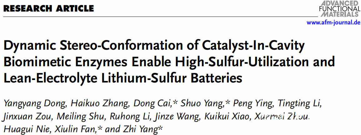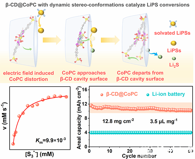 近日,我院杨植教授团队联合浙江大学的范修林教授,在国际知名期刊Advanced Function Materials上发表题为“Dynamic stereo-conformation of catalyst-in-cavity biomimetic enzymes enable high-sulfur-utilization and lean-electrolyte lithium-sulfur batteries”的文章。该工作,受启发于天然酶结构中各组分的协同作用,巧妙将磺化钴酞菁(CoPC)催化中心植入β-环糊精(β-CD)腔中,在硫正极中高精度地构筑了仿生酶催化剂(β-CD@CoPC)。这种多功能的β-CD@CoPC催化剂显著提高了贫电解质锂硫电池的硫氧化还原活性,同时加速了放电产物Li2S在催化剂表面的解离。结果表明,具有β-CD@CoP仿生催化剂的Li−S软包电池实现了优异的电化学性能。通过多种半原位/原位实验手段系统地确定了电化学性能改进的根源。更重要的是,通过拟合米氏方程确定了米凯利斯常数(Km)是锂硫电池仿生酶催化活性的关键描述符,有助于快速、高效地筛选Li-S电池催化剂。