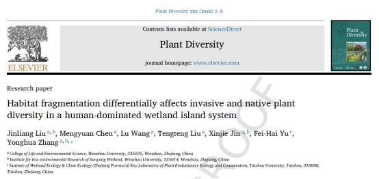 近日,8868体育_8868(中国)生命与环境科学学院植物生态与进化课题组在国际期刊《Plant Diversity》(中科院SCI期刊分区一区)上发表题为“Habitat fragmentation differentially affects invasive and native plant diversity in a human-dominated wetland island system”的论文。