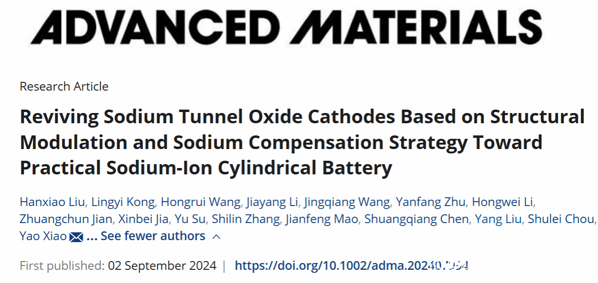 该成果以“Reviving Sodium Tunnel Oxide Cathodes Based on Structural Modulation and Sodium Compensation Strategy Towards Practical Sodium-ion Cylindrical Battery”为题,发表在《Advanced Materials》上,8868体育_8868(中国)为第一通讯单位,我院硕士研究生刘含笑和孔令益为共同第一作者。