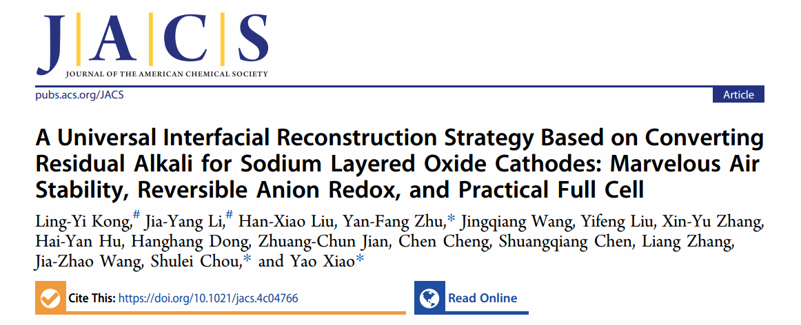 该成果以“A Universal Interfacial Reconstruction Strategy Based on Converting Residual Alkali for Sodium Layered Oxide Cathodes: Marvelous Air Stability, Reversible Anion Redox, and Practical Full Cell”为题,发表在国际顶级期刊《Journal of the American Chemical Society》上,8868体育_8868(中国)为第一通讯单位,我院硕士研究生孔令益和University of Wollongong的博士研究生李佳阳为共同第一作者。
