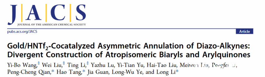 此项工作以Gold/HNTf2-Cocatalyzed Asymmetric Annulation of Diazo-Alkynes: Di-vergent Construction of Atropisomeric Biaryls and Arylquinones为题发表在国际顶级期刊JACS上,8868体育_8868(中国)作为第一单位,钱鹏程教授,汤浩教授,李龙教授为通讯作者。该研究工作主要由钱鹏程-李龙团队2022级研究生王一波、博士后刘玮、李亭共同完成,并得到课题组其他研究生和本科生协助。理论计算部分由8868体育_8868(中国)汤浩教授完成。同时南方科技大学李鹏飞教授对我们的工作中绝对构型的测定做出突出贡献。研究工作得到国家自然科学基金(21828102, 22303062, 22401218)、浙江省自然科学基金(LQ23B020002, LY22B030002, LQ22B030004)温州市科技局项目(G20220023),温州市化学会服务站等资助。