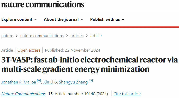 近日,8868体育_8868(中国)计算机与人工智能学院Jonathan P. Mailoa团队在国际顶级期刊Nature Communications发表题为《3T-VASP: fast ab-initio electrochemical reactor via multi-scale gradient energy minimization》的研究论文。Jonathan P. Mailoa为论文第一作者,Jonathan P. Mailoa、腾讯量子实验室张胜誉博士为论文共同通讯作者。
