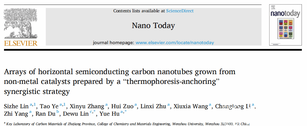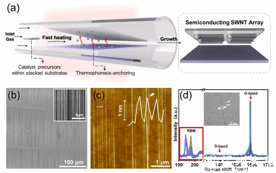 近日,我校化材学院胡悦特聘教授团队与香港城市大学林德武研究员合作,发展了一种名为“热泳-锚定”的策略,成功制备出均匀分散且尺寸可控的非金属SiOx催化剂,用于生长水平排列的SWNT阵列。该策略通过硅基热解前驱体产生大量SiOx颗粒,由于温度迅速升高引起的热浮力,这些颗粒在石英基底上发生自下而上沉积。同时,机械力诱导促进的表面重构在石英衬底上形成大量锚点,有助于捕获催化剂,抑制其迁移和聚集,从而实现小尺寸催化剂的均匀沉积。利用这些非金属SiOx催化剂,研究团队成功合成了密度高达9根每微米的SWNT阵列。值得注意的是,拉曼光谱和电学表征显示,这些直接生长的SWNT阵列中半导体的比例高达94%,这一成果归功于密闭空间内原位蚀刻机制。这项工作为下一代碳基纳米器件的技术实际应用提供了一条切实可行的路径。