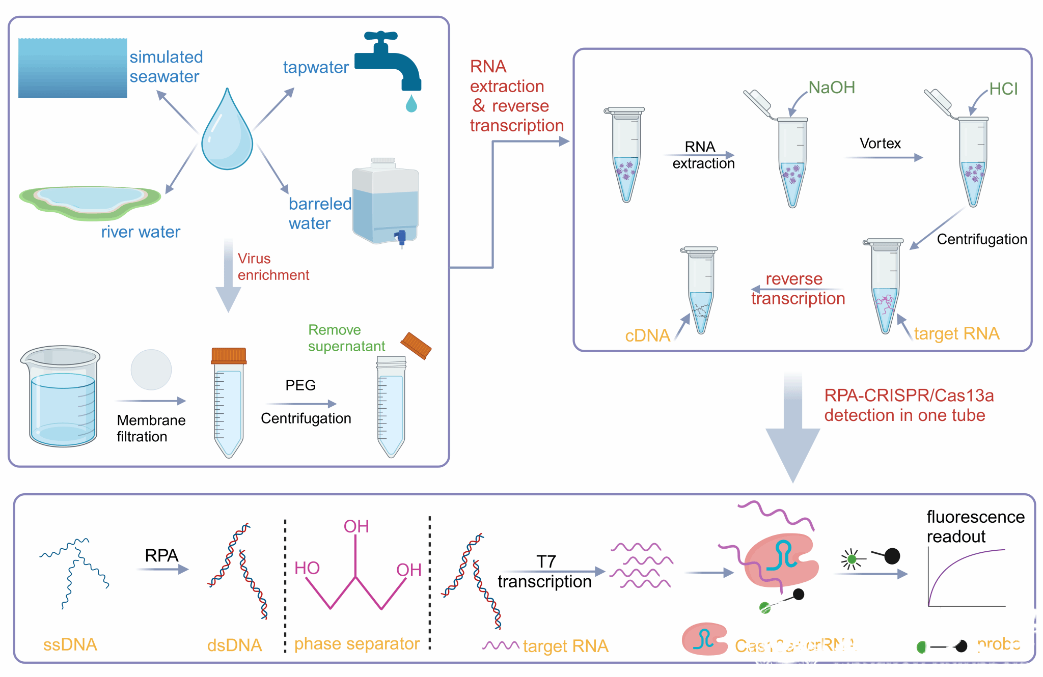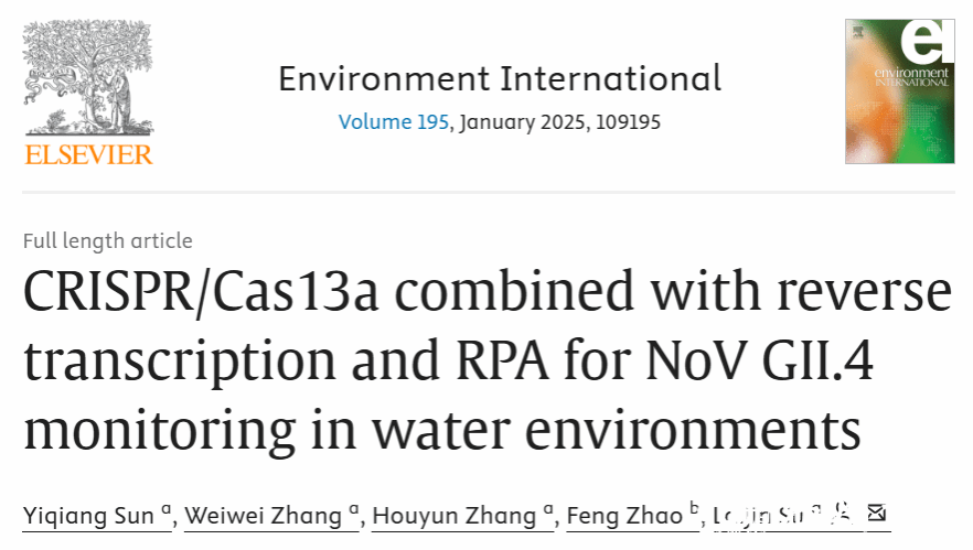 8868体育_8868(中国)生命与环境科学学院吴明江教授团队结合自身优势开展环境毒理和病原检测等交叉研究,取得了系列研究成果。近日,苏来金教授课题组在环境领域著名学术期刊Environmental International杂志上(SCI一区TOP 期刊,IF=10.3)发表了题为“CRISPR/Cas13a combined with reverse transcription and RPA for NoV GⅡ.4 monitoring in water environments”的研究性论文。该论文基于重组酶聚合酶扩增技术(RPA)和CRISPR/Cas13a系统,建立了一种适用于多种水环境、准确可靠、简便快速的GⅡ.4型诺如病毒定量检测方法,该方法在复杂水环境和资源有限地区的诺如病毒快速检测表现出巨大的应用潜力。