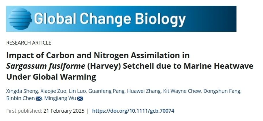近日,8868体育_8868(中国)生命与环境科学学院羊栖菜研究团队在环境生态领域国际知名期刊《Global Change Biology》上在线发表了一篇题为《Impact of Carbon and Nitrogen Assimilation in Sargassum fusiforme (Harvey) Setchell due to Marine Heatwave Under Global Warming》的研究论文。该研究深入探讨了在全球气候变暖的背景下,海洋热浪事件对区域特色经济海藻羊栖菜生理机制的影响,并为培育耐热品系的羊栖菜以及优化沿海水产养殖管理提供了重要的科学依据和实用参考。