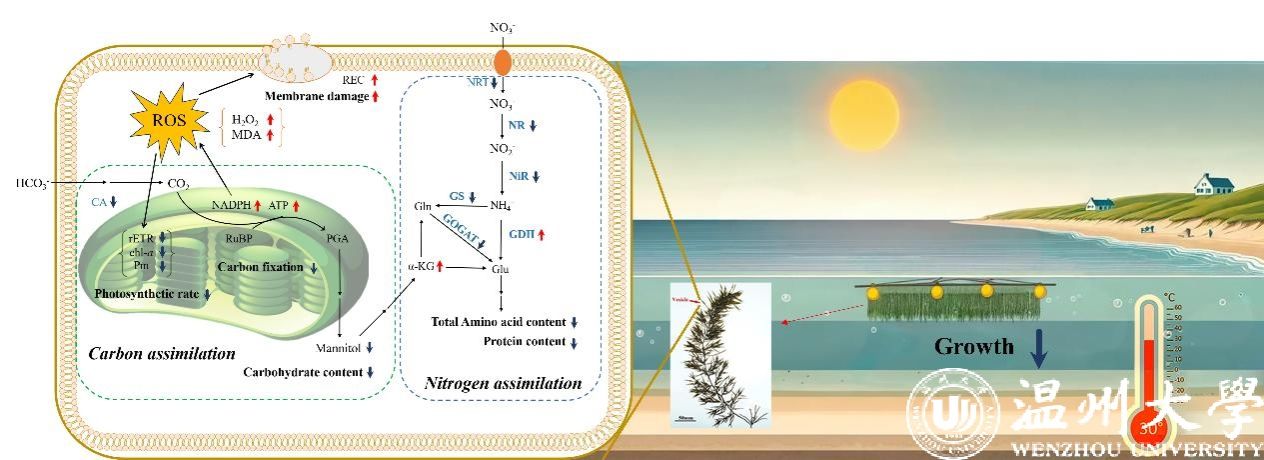 在全球变暖的背景下,羊栖菜作为一种表层海水养殖的经济作物,其产量和品质常受到海洋热浪等极端气候事件的影响。然而,海洋热浪对羊栖菜的具体影响机制尚未完全明确。为此,研究团队通过实验室实验和自然热浪模拟条件,分析了羊栖菜在这些环境下的生理特征及转录组学数据。研究结果显示,热浪胁迫显著提高了藻体内的过氧化氢、丙二醛含量以及相对电导率值,破坏了细胞叶绿体结构,并降低了光合效率。此外,热浪胁迫还抑制了硝酸盐吸收速率及大多数与氮同化相关的酶活性,但谷氨酸脱氢酶活性显著上调,表明该蛋白酶可能在羊栖菜适应热浪胁迫中扮演重要角色。氨基酸组成分析发现,脯氨酸和丙氨酸对高温条件尤为敏感。进一步的自然热浪环境模拟验证实验显示,藻类在自然条件下表现出与实验室条件下一致的生理响应。该研究表明,海洋热浪通过增加羊栖菜的氧化损伤并抑制其碳氮吸收和同化能力,从而对其生长和产量产生负面影响。这一发现为培育耐高温品系的羊栖菜以及优化沿海水产养殖管理提供了重要的理论基础和实践指导。
