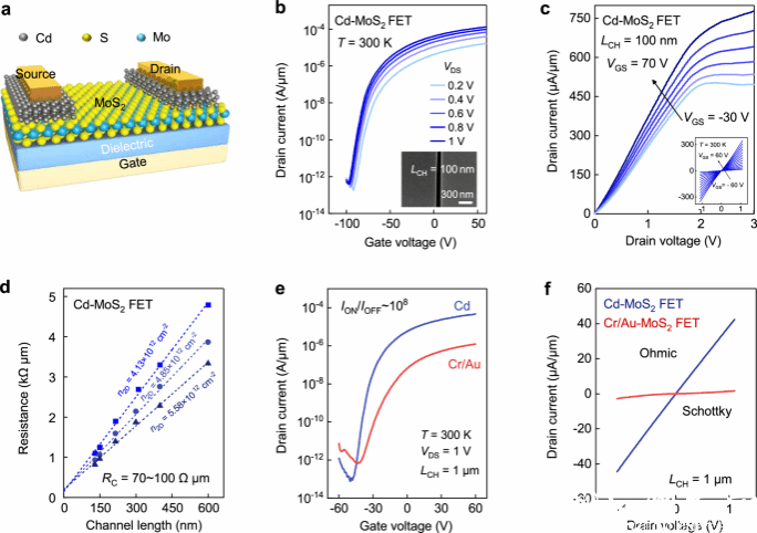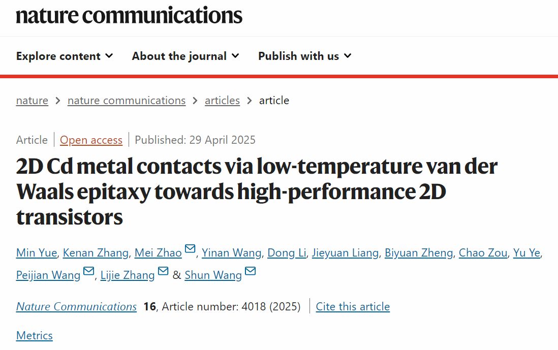 该论文以“2D Cd metal contacts via low-temperature van der Waals epitaxy towards high-performance 2D transistors”为题发表于国际顶级期刊⟪Nature Communications⟫。8868体育_8868(中国)为第一通讯单位,我院22级硕士生岳敏为第一作者。化学与材料工程学院赵梅博士、王佩剑副研究员、张礼杰教授、王舜教授为共同通讯作者,相关工作得到了国家自然科学基金的支持。