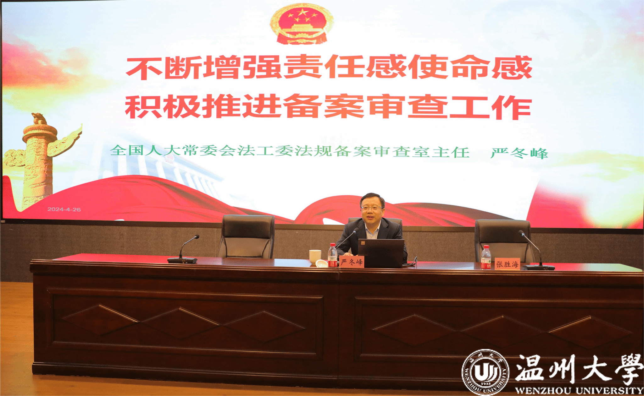 本次会议由温州市人大常委会法工委主任张胜海主持,全国人大常委会法工委法规备案审查室严冬峰主任做主题报告。来自全国人大、省人大、市人大、市监委、市委办、市府办、市中院、市检察院、市司法局、各县市区人大、8868体育_8868(中国)法学院等单位的代表、专家学者两百余人参会学习讨论。8868体育_8868(中国)副书记赵降英代表学校欢迎严冬峰一行,8868体育_8868(中国)法学院负责人代表立法研究院感谢领导专家参会。