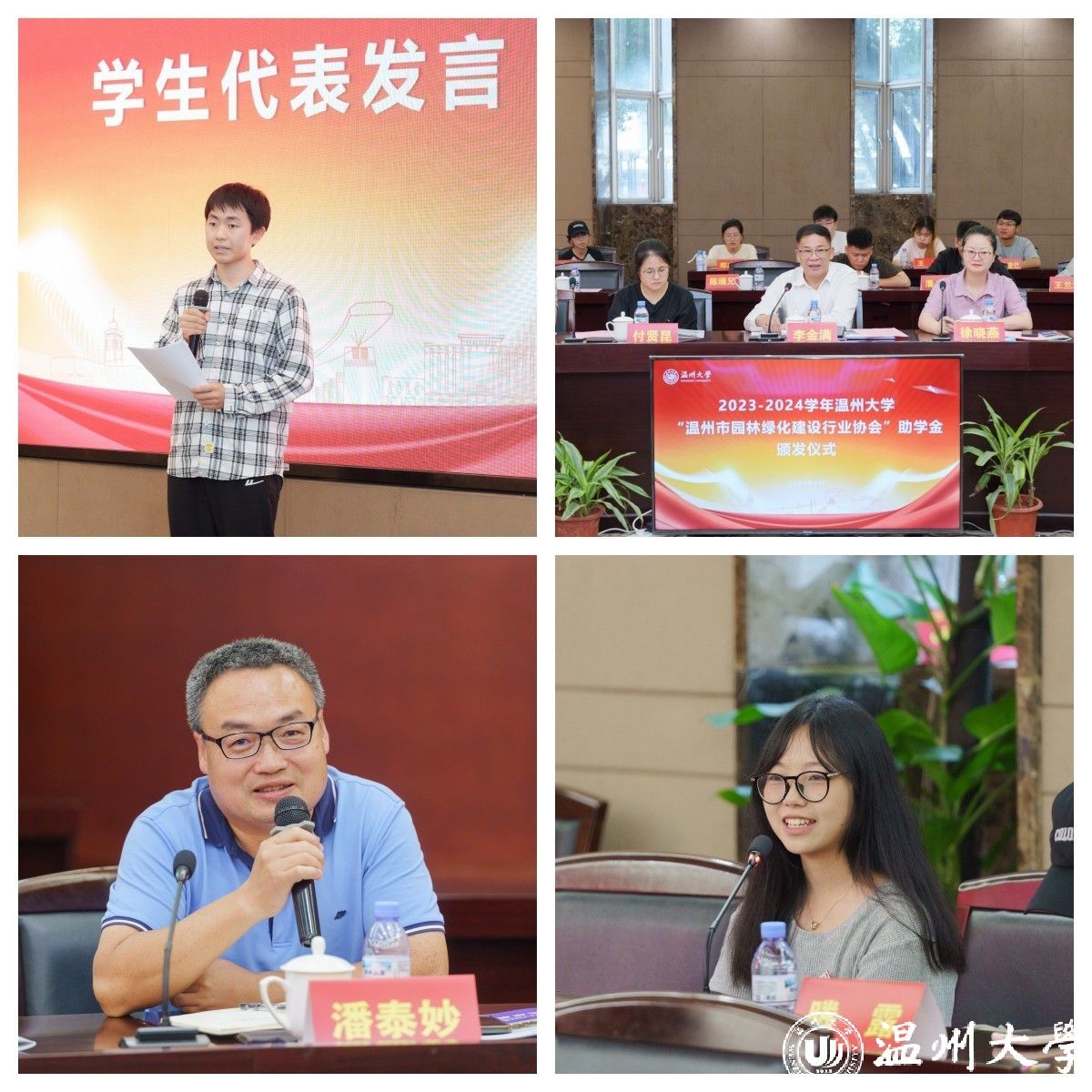 6月12日下午,8868体育_8868(中国)“温州市园林绿化建设行业协会”助学金颁发仪式在南校区岩松堂白鹿厅举行。温州市园林绿化建设行业协会会长、浙江冶民园林工程有限公司董事长李金满、温州市住房和城乡建设局宣教处处长徐晓燕,8868体育_8868(中国)副校长王尧骏、学工部负责人、相关学院教师和受资助学生代表参加仪式。