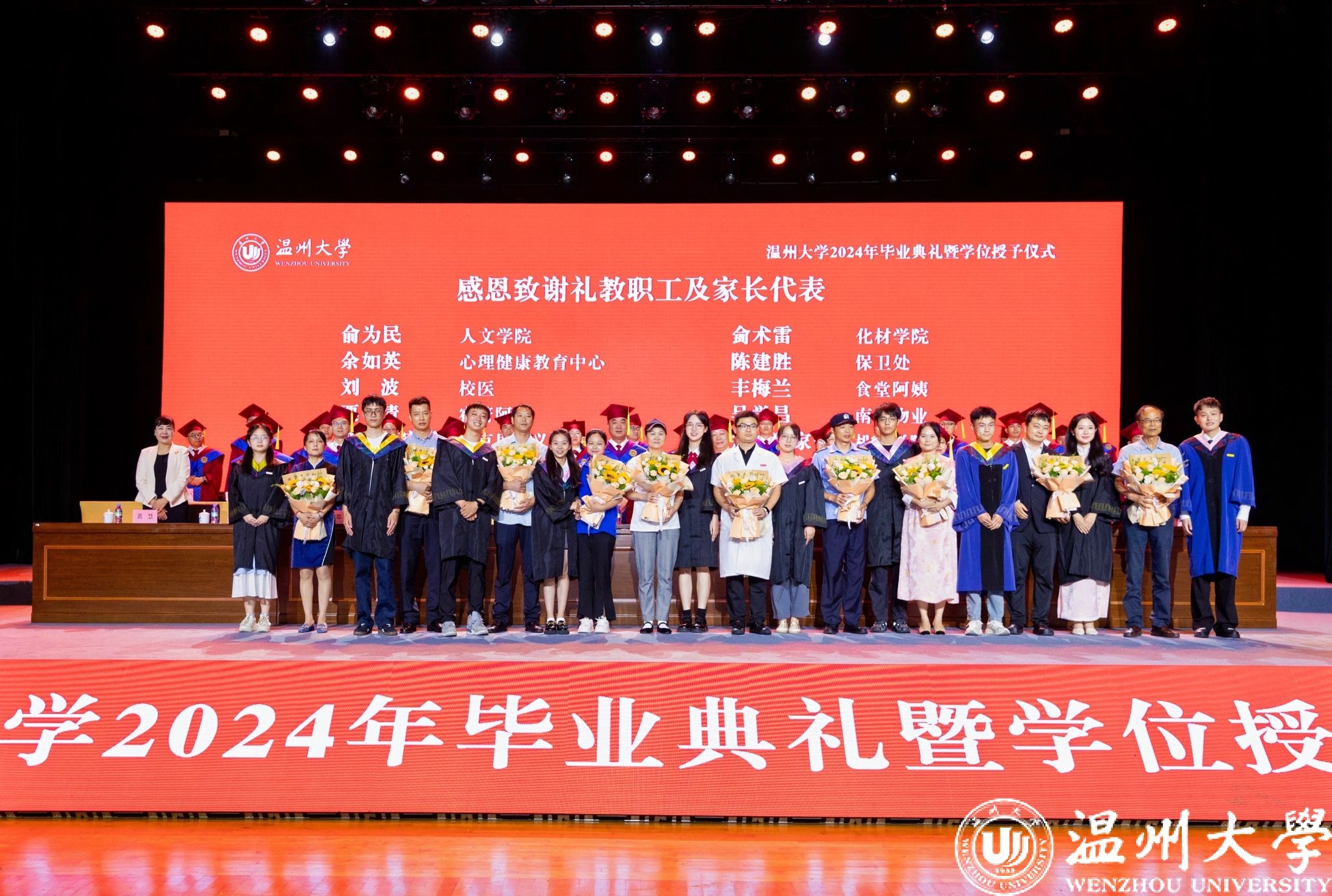 教诲如春风,师恩似海深。典礼上,毕业生代表为教职员工及家长代表献花,感谢他们无私付出与点滴呵护。教职员工和家长们的一路护航,助力每一位温大学子追逐梦想、再启新程。老师与家长代表们祝福毕业生策马扬鞭,奔赴美好前程。