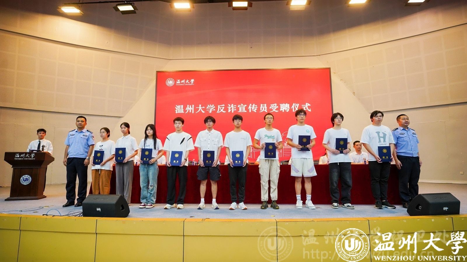 茶山派出所教导员张朝晖、温州市反诈中心警官刘昱洲为各学院学生代表颁发“8868体育_8868(中国)反诈宣传员”聘书,并呼吁我校师生积极参与反诈宣传中,为平安温大贡献青春力量。