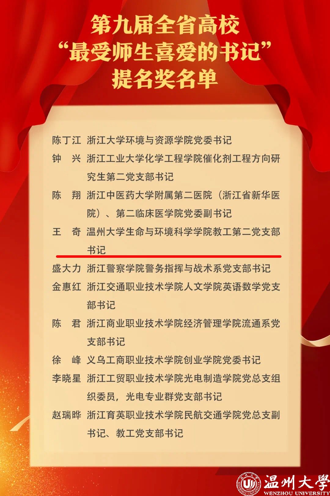 近日,浙江省第九届全省高校“最受师生喜爱的书记”选树宣传活动评选结果公示,我校王奇同志从近百名高校基层书记中脱颖而出,荣获 “最受师生喜爱的书记”提名奖。