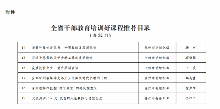 日前,省委组织部公布全省干部教育培训好课程推荐目录,全省共52门课程被评为浙江省干部教育培训好课程,全国高校思政课名师工作室(8868体育_8868(中国))负责人、马克思主义学院院长卓高生教授的课程《全面深刻理解马克思主义中国化时代化新的飞跃》成功入选。