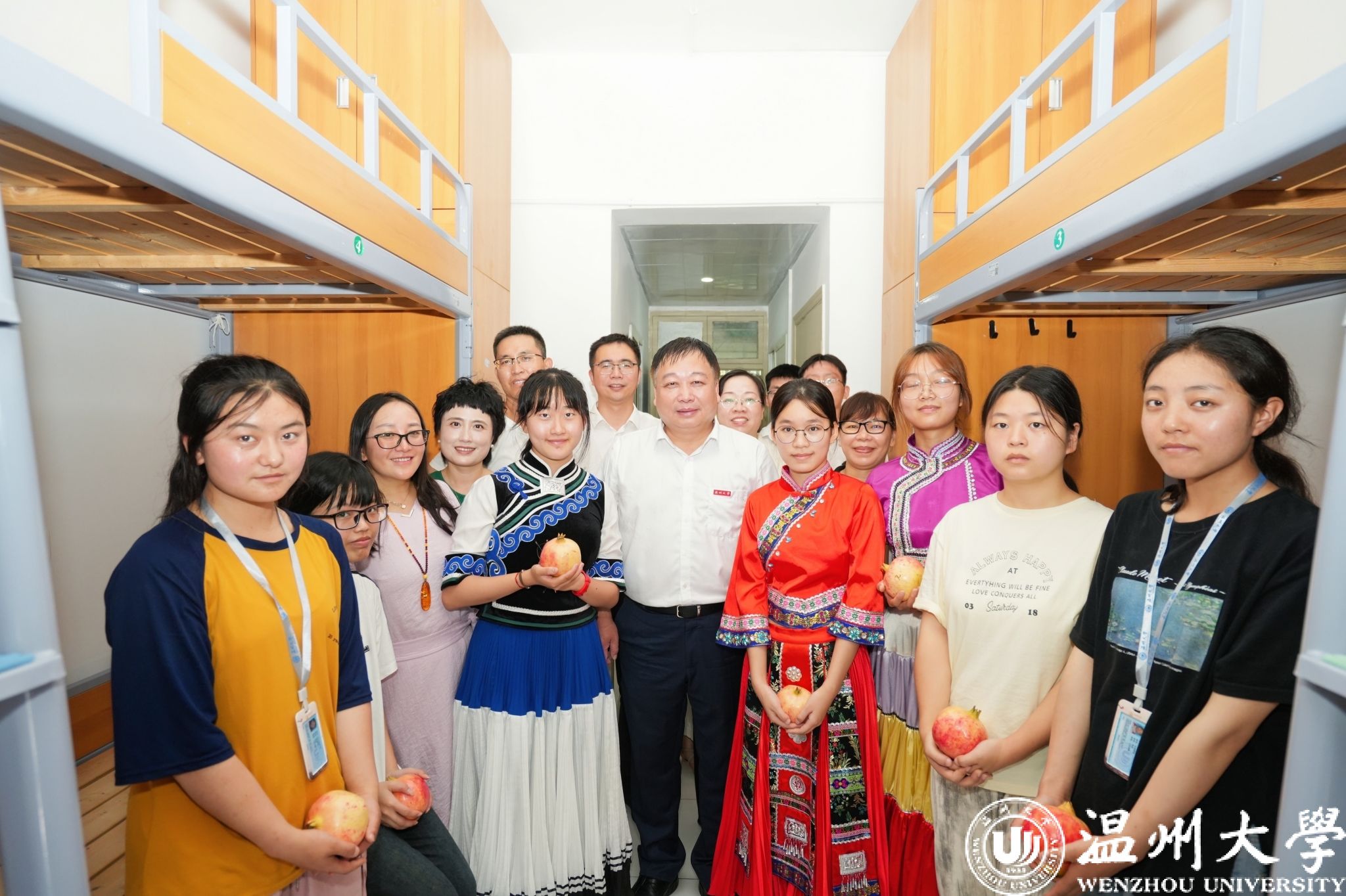 赵敏走进人文学院、马克思主义学院等新生寝室,亲切与新生交谈。人文学院2024级广告专业新生寝室,由来自汉族、藏族、水族、穿青人、布依族、壮族6个民族的同学组成,他鼓励新生要秉承温大“求学问是,敢为人先”精神,坚定理想信念,并送上了大石榴作为开学礼物,希望各民族同学团结一致,籽籽同心。